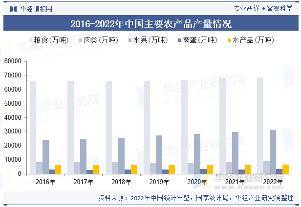 2022年,全国次要农区大部门时段光温水婚配优良,病虫害偏轻发生,景象形象前提总体有益于粮食做物发展发育和产量构成,但夏日长江流域高温干旱,东北地域南部农田渍涝灾祸偏沉,对粮食出产形成必然影响。按照国度统计年鉴的统计口径,2022年我国粮食实现减产丰收,达68652。7万吨,比上年添加368万吨,粮食产量持续8年不变正在1。3万亿斤以上。肉类、生果、禽蛋、水产物产量别离为9328。4万吨、31296。2万吨、3456。4万吨、6865。91万吨。