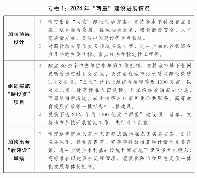 二是刊行超持久出格国债支撑“两沉”扶植取得积极进展。着眼于系统处理强国扶植、平易近族回复历程中一些严沉项目扶植的资金问题,从2024年起刊行超持久出格国债支撑国度严沉计谋和沉点范畴安万能力扶植。自上而下、软硬连系,成立实施项目储蓄、集中联审、专款公用、强化监视等全链条推进保障机制。“硬投资”方面,严酷做好项目筛选,2024年放置7000亿元超持久出格国债支撑1465个严沉项目扶植,项目根基全数开工、全年完成投资跨越1。2万亿元。“软扶植”方面,项目扶植和配套相连系,结实推进规划编制、政策制定和体系体例机制立异,不竭完美投入机制、提高投入效率。规范项目全过程办理方面,出台“两沉”扶植相关办理法子,督促项目加速开工扶植,严酷资金监管,加强监测安排和现场监视查抄,确保建成优良工程、精品工程、安心工程。