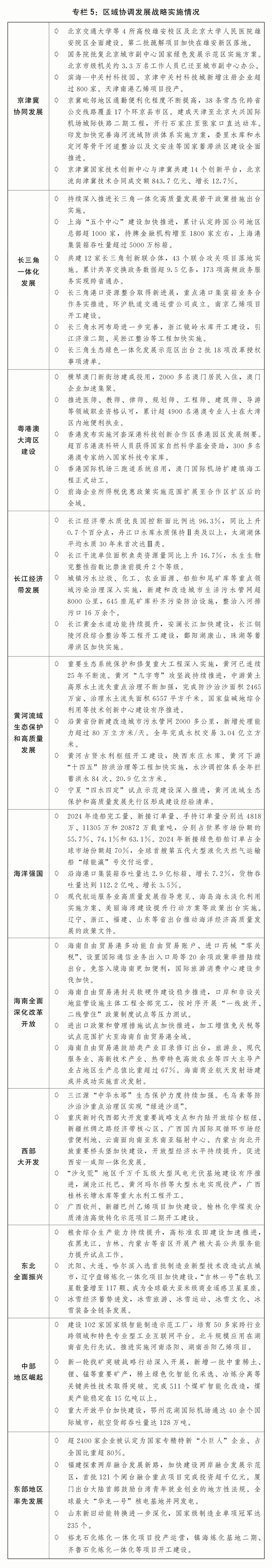 一是区域协调成长积厚成势。京津冀协同成长走深走实,正在京相关高校、病院、地方企业总部及二子公司分批向雄安新区疏解,城市副核心行政办公、商务办事、文化旅逛等功能不竭完美,进一步支撑天津滨海新区高质量成长若干政策办法出台实施,三省市互联互通交通收集愈加完美、财产链上下逛协做持续强化、公共办事共建共享程度进一步提拔。长三角一体化高质量成长深切推进,生态绿色一体化成长现范区授权压茬推进,口岸资本整合、轨道互联互通等取得新进展,上海“五个核心”扶植进一步加速。粤港澳大湾区扶植迈上新台阶,横琴粤澳深度合做区封关“一线”“二线”分线万名澳门居平易近正在合做区栖身糊口,支撑河套深港科技立异合做区深圳园区、园区联动成长,立异要素跨境流动愈加便利。长江经济带共抓大、不搞大开辟成效显著,进一步抓实抓好长江大工做三年步履打算出台实施,长江十年禁渔取得较着成效,长江畔流持续5年连结Ⅱ类水质,分析立体交通走廊加速建立,沿江高铁全线开工扶植。黄河道域生态和高质量成长迈出程序,农业面源、城镇糊口、工业和尾矿库污染管理深切推进,8万余个入河排污口开展溯源整治,一批生态修复沉点项目加速扶植,黄河干流持续3年连结Ⅱ类水质。海洋强国扶植深切推进,海洋强省、现代海洋城市、全国海洋经济成长现范区立异成长,海洋生态质量持续改善,海洋出产总值超10万亿元。