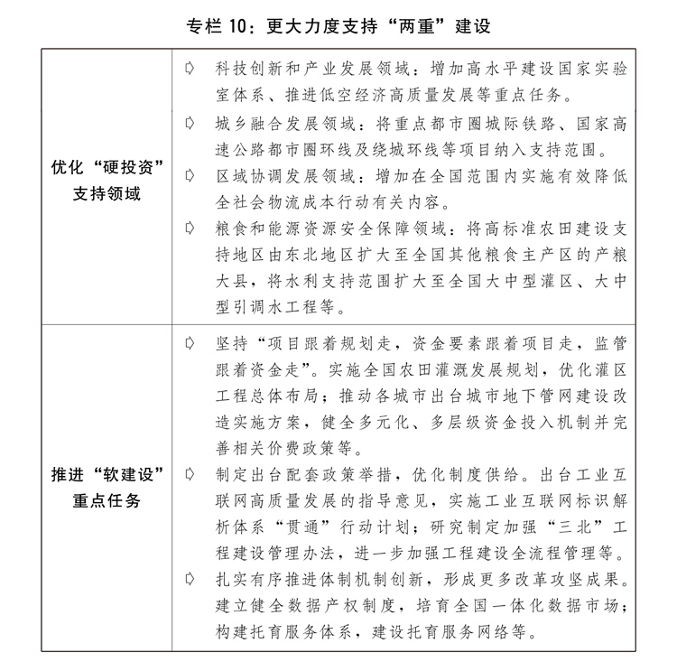 三是加力推进“两沉”扶植。进一步完美自上而下的工做机制,加强“两沉”扶植项目储蓄,更好统筹“硬投资”取“软扶植”。放置超持久出格国债8000亿元支撑“两沉”扶植,进一步优化具体投向并提高项目支撑比例,沉点支撑根本研究能力提拔、将来财产成长、东北等沉点地域高尺度农田扶植、大中型灌区新建及大中型引调水和大中型水库扶植、长江经济带生态和绿色成长、农业转移生齿市平易近化公共办事系统扶植、高档教育提质升级、城市地下管网管廊扶植等方面使命,强化超持久贷款等配套融资,高质量推进“硬投资”项目谋划实施。加鼎力度鞭策“软扶植”政策落地收效。