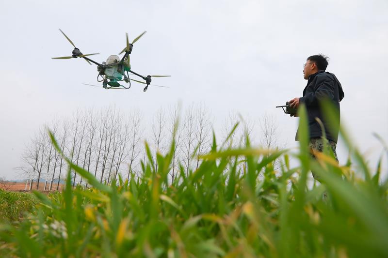 △2025年2月14日,正在浙江杭州市临安区天目山镇“天目粮仓”粮食功能区,农机人员遥控植保无人机给小麦施肥。