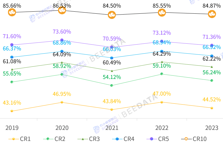 分析来看,2019~2023年,中国各省大豆产量CR5、CR10波动下降,CR1、CR2、CR3、CR4小幅添加,此中CR1增加最为较着——意味着中国大豆出产仍然呈现集中态势,2023年,“、、安徽、四川、河南、、湖北、贵州、山东、江苏”10个省域大豆种植面积顺次位列全国前1~10位,面积规模均正在330万亩以上——合计达13433。3万亩(约合1。34亿亩)、约占全国大豆种植面积的85。5%;“、、四川、安徽、河南、、山东、江苏、湖北、湖南”10个省域大豆产量顺次位列全国前1~10位,产量规模均正在35万吨以上——合计达1768。91万吨、约占全国大豆产量的84。87%。此中,“江苏”大豆种植面积虽然位列全国第10位,但其单产程度较高,位列全国第2位、产量位列全国第8位;“贵州”大豆种植面积虽然位列全国第8位,但其单产程度较低,位列全国第29位、产量位列全国第15位;“湖南”大豆种植面积虽然位列全国第13位,但其单产程度相对较高,位列全国第4位、产量位列全国第10位;“、、安徽、四川、河南、、湖北、这8个省域的大豆种植面积取产量规模合计别离为12737。8万亩(约合1。27亿亩)、1668。53万吨——别离占全国的81。08%、80。06%。