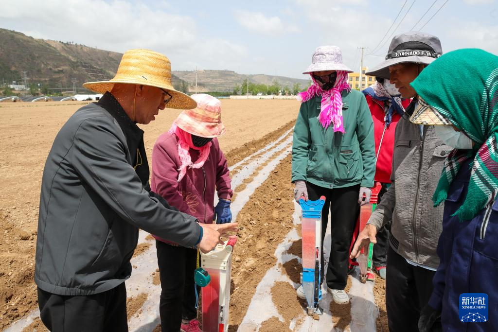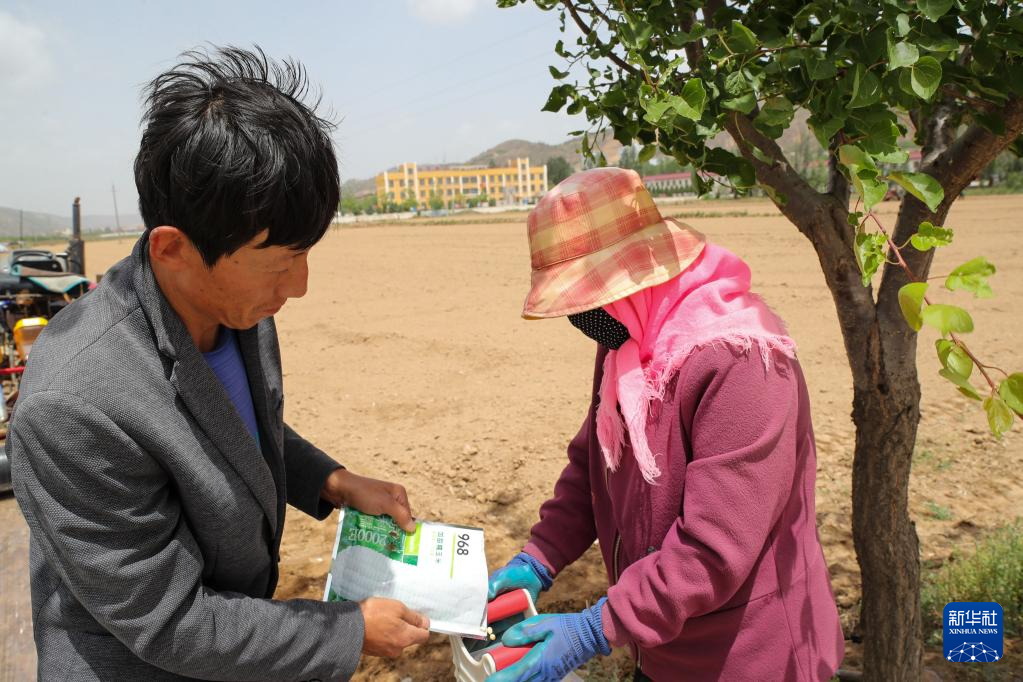 5月22日,村平易近将玉米种子倒入点播器预备播种。正在环县曲子镇五里桥村,村平易近手持点播器点播大豆。记者 郎兵兵 摄。