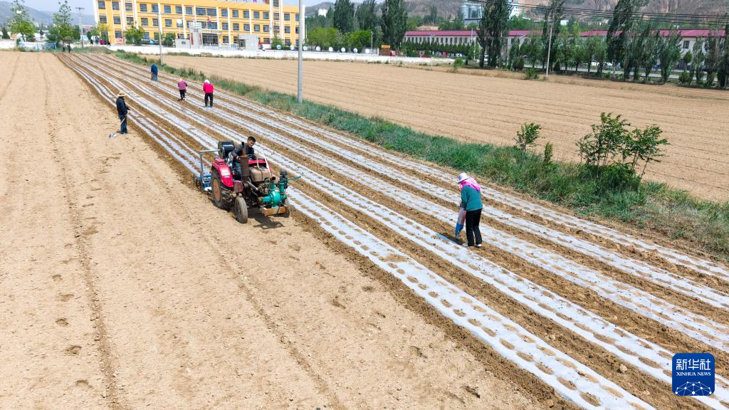 5月22日,正在环县曲子镇五里桥村,村平易近们抢抓雨后墒情一边覆膜一边点播大豆(无人机照片)。记者 郎兵兵 摄!