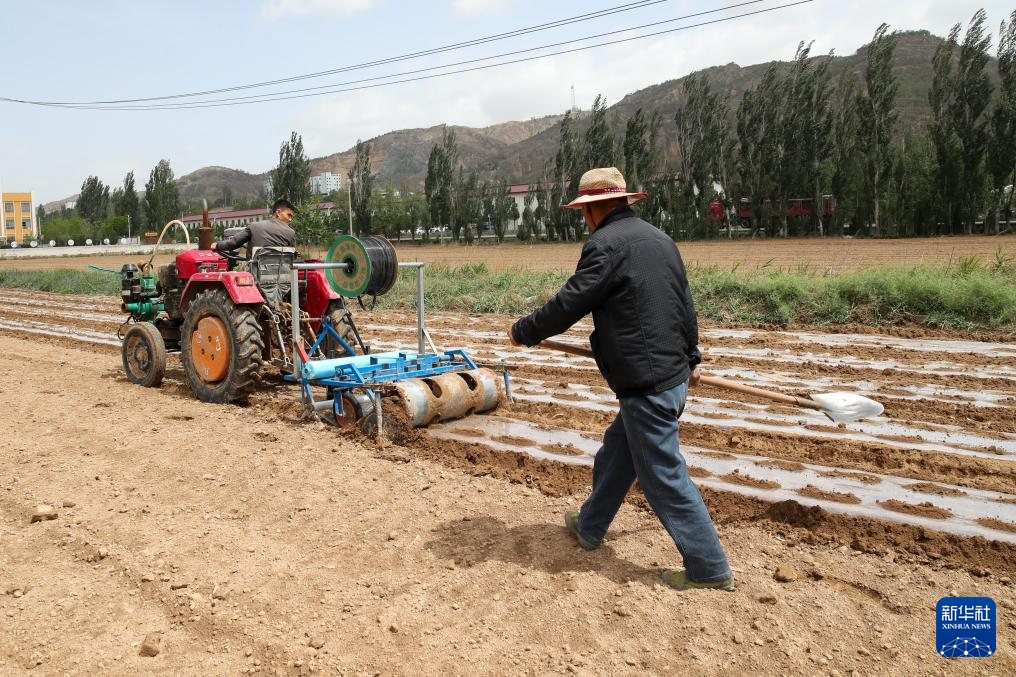5月22日,正在环县曲子镇五里桥村,村平易近对农田实施机械覆膜保墒功课。记者 郎兵兵 摄。