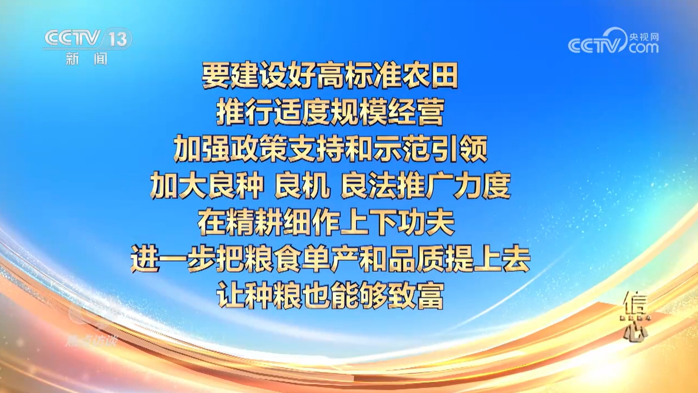 粮食事关国运平易近生,粮食安满是的主要根本。本年3月,习总来到湖南调查,走进本地农田,领会粮食出产环境。他强调:“要扶植好高尺度农田,奉行适度规模运营,加强政策支撑和示范引领,加大良种、良机、良法推广力度,正在精耕细做上下功夫,进一步把粮食单产和质量提上去,让种粮也可以或许致富。”?。