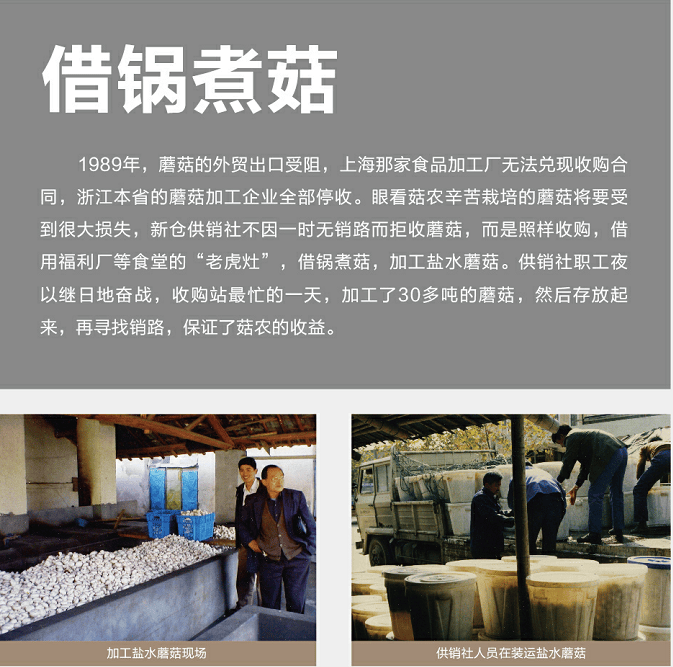 回溯至1979年,新仓供销社引进菌类,正在新仓、新庙两的45个出产队试种蘑菇3700平方米。试种成功后,栽培面积不变成长,并逐渐扩大到全县。“借锅煮菇”是新仓供销社不因一时无销而拒收蘑菇,借用福利厂等食堂的“山君灶”,借锅煮菇,加工盐水蘑菇,存放起来再找销,菇农的收益。