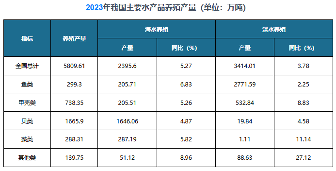产量方面,虽然我国水产养殖面积下降,但得益于我国水产养殖手艺的不竭提拔和养殖规模化的持续推进,我国水产养殖产量呈稳步增加趋向。数据显示,2023年我国水产养殖产量5809。61万吨,同比增加4。39%。此中海水产物产量3585。32万吨,同比增加3。64%;淡水产物产量3530。85万吨,同比增加3。65%;海水产物取淡水产物的产量比例为50。4!49。6。