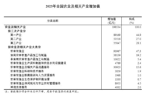 据国度统计局网坐动静,经核算,2023年全国农业及相关财产添加值为198534亿元,占国内出产总值(P)的比沉为15。34%。分三次财产看,农业及相关财产添加值中,第一财产、第二财产、第三财产添加值占比别离为44。9%、27。0%、28。1%。第一财产添加值规模最大、从农业及相关财产大类看,农林牧渔业、食用农林牧渔产物加工取制制、农林牧渔业及相关产物畅通办事添加值规模居前三,占农业及相关财产添加值的比沉别离为47。3%、19。2%、15。6%。