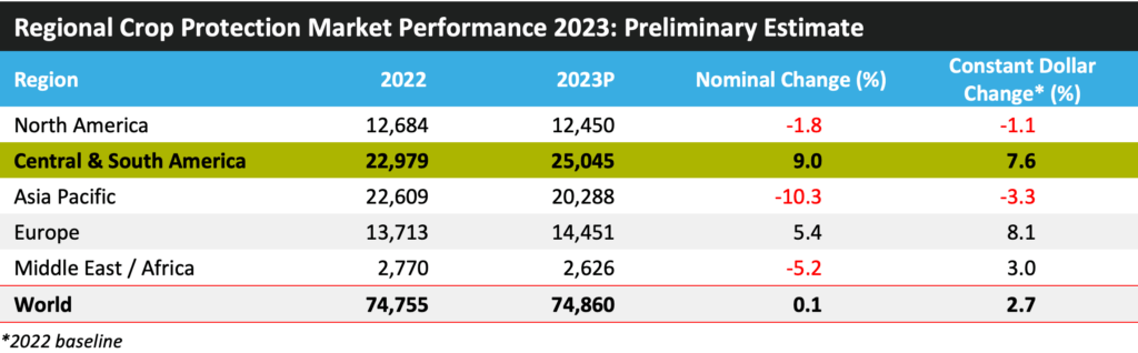 本文将概述中美洲和南美洲做物市场的成长、研究现状以及估计影响来岁市场成长的次要将来趋向。南美洲南部天气很是干燥;亚洲部门地域(例如印度尼西亚)干燥,但其他国度(例如越南)天气前提有益;美国部干旱;欧盟天气前提有益。为缓解供应担心而进行的大量预购,以及次要地域(美国西部和欧洲)中下旬的晦气气候,导致库存添加。目前零售商和农场库存正正在耗损之中,因为虫害压力相对较高以及上述地域市场的前提有所改善,本地的用量得以维持。正在中美洲和南美洲,拉尼娜现象导致阿根廷、巴拉圭和巴西南部严沉干旱和高温,特别影响了大豆出产。阿根廷地域还遭到野火的影响。该地域持续的干旱也对物流发生了影响,阿根廷罗萨里奥的巴拉那河水位达到 1945 年以来的最低程度。然而,巴西南部较少地域的潮湿前提虽然有益于产量,但也导致虫害压力添加,特别是粉虱和白霉。潮湿的气候了农人的田间勾当,了及时害虫防治产物的机遇。此外,次要种植区的大豆大面积遭到种子腐臭病的影响,而巴西Safrinha玉米做物的玉米叶蝉压力也很大。2023年,干旱前提影响了该地域的地域,特别是阿根廷,这是一个严沉的晦气要素,出格是正在受影响最严沉的地域,做物弃耕率很高。然而,巴西这一次要做物市场的环境却较为乐不雅,做物面积添加和虫害压力加大推进了用量。按照Sindiveg的数据,2023年第一季度,巴西利用农药处置的做物面积添加了13。4%,这也是2022/23农业年度的环节施药期。虽然取2022年比拟,次要农用化学品(特别是草甘膦和草铵膦)的价钱下跌压低了市场价值,但从汗青尺度来看,2022/23年度初期的价钱仍然很高,因而估计本年度不会对市场价值发生最严沉的影响。虽然干旱前提对大豆产量以及比来寒冷前提对Safrinha玉米产量发生了影响,但中美洲和南美洲的做物市场仍受益于巴西持续强劲的农业经济。这些要素正在很大程度上被较高的种植面积以及北部地域较高的病虫害压力所抵消,北部地域较潮湿的气候更有益于病虫害的发生。阿根廷的环境稍显晦气,气候对所有次要做物的影响更大。正在其他国度,干燥的气候也对巴拉圭和墨西哥形成了影响,但智利、哥伦比亚和玻利维亚等其他出名市场的环境则比力乐不雅。因为上述要素,我们估计到 2023 年,该地域做物市场的表面价值将增加 9%,达到 250。45 亿美元。