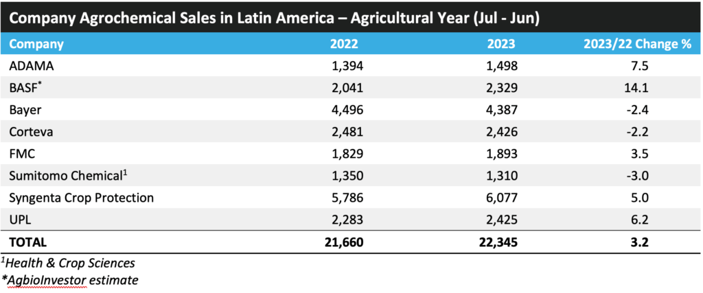 下表概述了2023农业年(2022年7月-2023年6月)拉丁美洲次要农化公司正在农业年的发卖业绩: